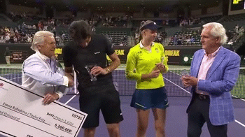 事情发生在北京时间3月4日,莱巴金娜与搭档弗里茨击败了阿尼西莫娃/勒纳·钱,成功卫冕印第安维尔斯站混双抢十赛冠军(艾森豪威尔杯)。在赛后的颁奖仪式上,有两位男嘉宾为这对冠军组合颁发了价值20万美元的赛事奖金以及冠军奖杯。